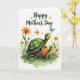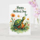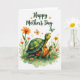This card shows two friendly, cartoon-style shelled creatures in the center, with the larger one leaning in protectively as it gently supports the smaller companion, their big eyes meeting with a tender, caring look ❤️. Their shells are detailed with swirls and patches in leafy greens and warm oranges, outlined neatly with soft, painted shading. Along the bottom edge, light washes of green suggest a grassy ground, dotted with small wildflowers in orange and soft pink with thin green stems 🌼. A few butterflies drift around them, some with orange wings and others in muted green, adding a calm sense of motion above the pair. Near the top, a flowing line of text announces a Mother’s Day message in deep emerald green, centered and easy to notice against the open space. The background stays bright white so the creatures and garden details feel airy and unhurried, with plenty of breathing room around the artwork. The upper area remains open except for the emerald lettering, while butterflies hover nearby and flowers cluster near the lower border.