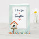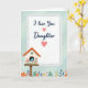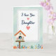 This card features a white rectangular panel centered on a pale aqua background with a soft, painted texture. Around the panel is a delicate white lace-like border that looks like tiny cutout loops and scallops. In the middle, the words “I love You Daughter” appear in deep blue lettering, with two small pink hearts tucked between the words for a sweet touch ❤️. The text sits neatly centered, leaving airy white space that makes the message stand out without feeling crowded. Beneath it, a cream-colored birdhouse with a warm orange roof adds a cozy, homey scene, and a small blue bird peeks from the round opening as if watching over a loved one. Along the bottom edge, a garden of simple flowers in orange, pink, yellow, and blue grows among green leaves, giving the picture a gentle, affectionate energy 🌼. A tiny green flower detail is visible on the birdhouse front, just below the opening.