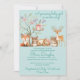 This beautiful baby shower invitation features a fox, two mice, a bunny,, sleeping bear, a deer and little bird who's sitting in the tree. The animals are all wearing floral headbands to the baby shower! The background is pale green with a darker green lettering. An easy to use template is provided for you to enter all of your personal baby shower information. The back side of the invitation has a darker green and white polka dots pattern and another little mouse with a floral headband.