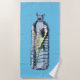 Cool beach towel, with graphic artwork of a great white shark trapped in a water bottle, against a blue swirl wave background. Customize to add your own text.