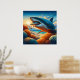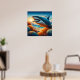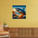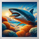 A painting of a great white shark showcasing its predatory nature by capturing a fish in its sharp teeth, depicting a fierce and dramatic underwater scene.