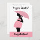 Preggers, Shondra? (Change the name to suit your person.) Written in modern black font with pink and black pregnant lady illustration. Congratulations! written in same modern black font on a matching pink background.