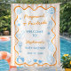 Welcome guests in cheerful summer style with this playful “Pregnant + Poolside” Baby Shower Fabric Welcome Sign, designed to bring fun, color, and personality to your celebration. Featuring soft peach stripes, bright sky blue illustrations, and a bold wavy orange frame, this charming design captures the carefree vibe of a sunny poolside baby shower.