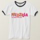 This funny maternity design will let everyone know they should be very nice to you or be very afraid of the monster pregnant woman! Fun orange and pink text says PREGZILLA with little stick people running away. Pink text underneath says BE AFRAID, VERY AFRAID. Cute gift for expectant moms. On maternity T-shirts, apparel, tote bags and more! PinkInkArt original!