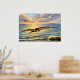 Prehistoric pterodactyl dinosaurs flying over the ocean at sunset.