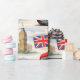 Wrap your gifts in the timeless charm of the British capital with this vintage London premium wrapping paper this beautifully detailed collage features the most iconic symbols of London including the classic red double-decker Roma bus the Majestic Big Ben, the houses of Parliament and stoic Royal guard in a traditional bar skin hat accented with the Union Jack flag and classic black cabs against a soft cloudy