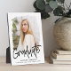Celebrate your graduate's achievement with a custom graduation photo keepsake. The plaque features the graduate's photo inside of a white textured mask frame with "Graduate" in a black handwritten script. Personalize the graduation photo plaque by adding the graduate's name, school, and graduation year.