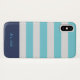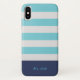 Preppy iPhone case with blue and white stripes, on the bottom a navy blue border as a monogram holder. Personalize with your very own monogram in elegant sans serif font and choose between two colors. This phone case can be paired with other accessories so check out our store for more items from our ''Nautical Stripes'' collection.