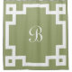 A white Greek key border frames a monogram in white script font on a thyme green background. Easily customize it with your own initial.