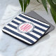 Keep your laptop protected with this preppy-chic striped sleeve! Design features classic nautical styling with wide navy blue and white stripes, a rope emblem, and your three-initial monogram in hot pink typeface.