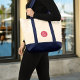 Love the durable cream colored canvas and navy blue contrasted handles. Perfect for carrying my laptop and papers.