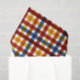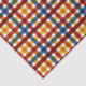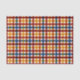 This tissue paper features a plaid pattern in yellow, orange, red and blue against a white background.