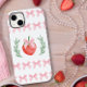 Iphone case with preppy coquette aesthetic in pink and white. Design features a strawberry with pink gingham bow, framed with a logo style laurel wreath and pattern borders of pink bows to match the strawberry logo. Designed for the iPhone 14 Plus but will fit many other models. If you choose a different model check the design still looks great in the preview and tweak if necessary (click "edit using design tool").