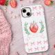 Personalized Iphone case with preppy coquette aesthetic in pink and white. Design features a strawberry with pink gingham bow, framed with a logo style laurel wreath, name banner and pattern borders of pink bows to match the strawberry logo. Designed for the iPhone 14 Plus but will fit many other models. If you choose a different model check the design still looks great in the preview and tweak if necessary (click "edit using design tool").