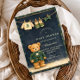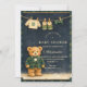 A charming preppy baby shower design featuring a sweet teddy bear dressed in a classic green plaid jacket and bow tie. Above the bear, a delicate clothesline displays tiny baby clothes and shoes, creating a nostalgic storybook nursery scene. The deep navy background and subtle tartan border add a refined, vintage-inspired touch that feels both elegant and playful. Perfect for a stylish baby shower celebration with a classic preppy aesthetic.