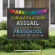 Celebrate your preschool graduate's milestone with this cute yard sign, featuring a rainbow bunting banner and decorative yellow, white, green, blue, and orange typography on a black chalkboard background. Personalize the text with your child's name, school, grade, and year of graduation. Can be customized for other grades (first grade, second grade, etc.).