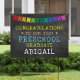 Celebrate your preschool graduate's milestone with this cute yard sign, featuring a rainbow bunting banner and decorative yellow, orange, blue, green, and white typography on a black chalkboard background. Personalize the text with the year of graduation and your child's name.
