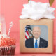 The photograph captures a moment in time during the Presidency Joe Biden the 46th President of the United States. Sunlight streams through a window, casting a warm glow on the figure of an Biden standing confidently in the center of the frame. Standing tall with arms straight, a gesture that suggests both authority and a hint of casual ease. --- Mr. Biden is dressed impeccably in a dark suit, the crisp fabric contrasting sharply with the clean lines of his white shirt. A blue adds a touch of personality to the ensemble. --- A glimpse of patriotism is evident in the background. An American flag stands proudly on a pole to the man's left, its vibrant colors a subtle counterpoint to the cool blue of the wall behind him. --- Reelection soon to come for President Biden is the focal point of the image. His short white hair frames a kind face, etched with the lines of a life well-lived. A warm smile plays on his lips, conveying a sense of confidence, wisdom, and perhaps a hint of amusement.