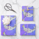This set of wrapping paper sheets have pretty abstract white crescent moons with faces decorated with bright colorful geometric shapes including triangles, circles and scrolls in colors of blue, purple, and yellow on a purple and blue sky background with stars.