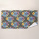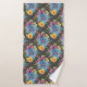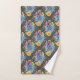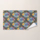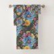 Pretty bath towel set design has large painted primary blue flowers with smaller ones in marigold yellow, purple and pink, all on a charcoal gray background giving it a dark and elegant look.