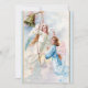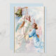 vintage painting of two angels with blue and white cloaks holding a gold cord and ringing a bell in the sky.