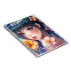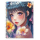 Personalized notebook. Beautiful girl with purple eyes and dark hair surrounded by yellow daffodils. Pretty floral and anime themed digital ai art.
