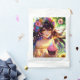 Birthday party favors. Pretty ai art depicting a beautiful girl with pink and purple flowers on her head holding a birthday cupcake.