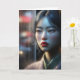 Blank card. Ai art on card is a sad Asian woman looking out the window watching it rain.
