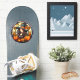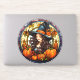 This large size seasonal vinyl sticker features a pretty witch with pumpkins and Fall leaves in a "stained glass" round. Digital image created with AI assist.