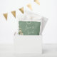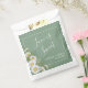 Pretty Spring/Summer wedding favor bag design features watercolor white daisies corner on basil green background with white customizable text blocks in modern fonts