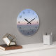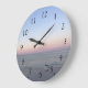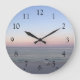 This pretty clock features a photo of a gorgeous beach sunset with beautiful pink, blue and purple colors. A cute white lifeguard shack sits at the forefront.