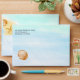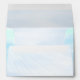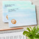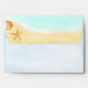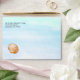 Lovely wedding invitation envelope done in blue and aqua, with a sandy looking beach, with shells, on the back flap. A lone sea shell decorates the front of the envelope. Black script text return address is ready to personalize for your beach theme wedding.