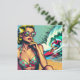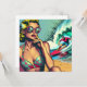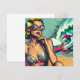 Pretty retro blonde pinup woman sitting on beach with sunglasses watching a hot surfer dude in vintage colors in a pop art comic style.