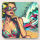 Pretty retro blonde pinup woman sitting on beach with sunglasses watching a hot surfer dude in vintage colors in a pop art comic style.