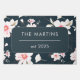 Pretty blush pink and dark blue floral pattern customized doormat includes your last name and est year with a lovely pink floral pattern on an elegant dark blue background with faux gold botanical elements.