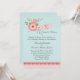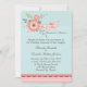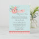 Pretty robin's egg blue wedding invitation, with a pretty coral pink banner and flowers, at the top and a coral polka dot and striped scalloped ribbon, across the bottom. Personalize the brown text to suit your needs. Pretty mix and match wedding products are available.