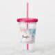 Acrylic tumbler with beautiful blue flowers on a pink background. An image of a rectangle shaped notebook page layered over top for you to write your text inside.