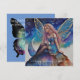 Watercolor birthday card with a pink hair fairy in a blue dress. She has flowers in her hair and Fancy gold and teal wings. She has a cloudy sky with a crescent moon behind her. Nice young girl birthday message inside, but this card can be given for any occasion.