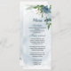 beautiful blue and white flowers and green leaves romantic wedding menu.