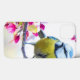 A phone case with an amazing photograph of the cutest little bird perched on a branch covered in pink blossoms and green leaves. The bird has a blue head and yellow body with a very sweet face. Adorable.