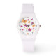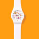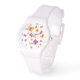 I only have one complaint. I ordered the watch with clear case and strap, and what was sent was white case and strap. I'm going to keep it because 1) it looks very nice in white, and 2) it would take too long to get a replacement made and sent in time for my occasion. Aside from the mix up with the color, the watch does look very good in white. The purple dial is actually sparkly which did not show in the online images. That was a nice surprise. If you like Swatch watches this is very similar to those. It's 33.6mm in diameter, 10.5mm thick, and 40.6mm lug to lug. Stainless steel case back says 3ATM/30m WR, so no swimming or showering or submerging this one. If you like Woodstock, this is a great choice.