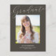 This elegant graduation postcard features calligraphy and a large photo. On the front, "Graduate" is written in pretty calligraphy script across the top, with a large photo below. At the bottom, you can add the graduate's name, school, and graduation year. The typography is light cream against an ash brown background. On the back of the grad postcard you can add a message to recipients and/or graduation party information.