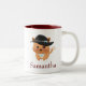 This pretty design is one a white coffee mug sporting a cat wearing a fancy hat. Your name is personalized using standard burgundy font, order your mug today!