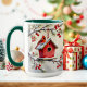 A beautiful Christmas coffee mug with a vintage cardinal sitting on a pine branches covered in snow and red berries.