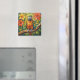 A sweet magnet with an impasto painting style parrot and colorful coral and yellow tropical flowers.