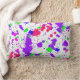 Pretty lumbar pillow with fun neon paint splatter on white, in shades of green, purple, red and fuchsia.