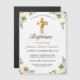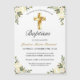 Pretty, creme colored roses with gentle, green botanical leaves are placed in each corner. A gold cross is prominently displayed in the top center of the design. Customize this baptism invitation with your baby boy or baby girl's information. Classic and traditional, it's perfect for your baby's special holy baptism.