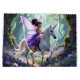 A beautiful African-American fairy in purple riding on a white magical unicorn through an enchanted forest. Pretty fairy tale forest themed girl's birthday gift bag.