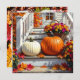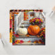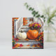 A lovely personalized Thanksgiving card full of colorful vibrant Fall leaves and pumpkins sitting o a farm house front steps. You can customize your Thanksgiving message on the back in the personalize area.