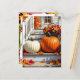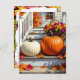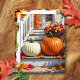 A lovely personalized Thanksgiving postcard full of colorful vibrant Fall leaves and pumpkins sitting o a farm house front steps. You can customize your Thanksgiving message on the back in the personalize area.